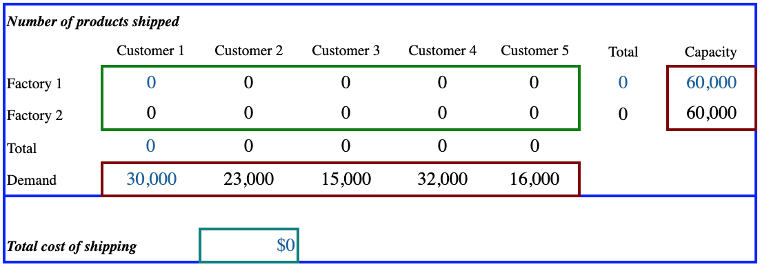 This approach allows us to solve a couple of transportation problems. For example, we may want to minimize the costs of shipping goods from factories to customers,