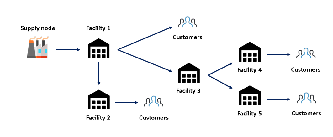 In many cases, a supply chain has a complex structure with multiple facilities with a sequential supply structure, i.e. has a few echelons. Figure 4 illustrates an example of such multi-echelon supply chain network. The network comprises both elements of a multi-echelon system where a stocking facility can either purely serve customer demand or just replenishes another facility, or does a combination of both. In Fig. 4, the outermost stocking facilities 2, 4, and 5 are customer facing units that directly serve customer demand. Stocking facility 1 is a central facility that, besides directly fulfilling customer orders, also replenishes facility 2. Facility 3 is another c entral facility that mainly replenishes 4 and 5. It gets its replenishment from the first facility. The first node that replenishes facility 1 is a supply node, such as a manufacturing plant or a vendor, for which we do not track inventory. Thus, facility 3 has no explicit target; though it can centrally keep inventory for nodes 4 and 5 in order to facilitate meeting their service level targets. The time gap between placing orders and receiving replenishment is characterized by an overall lead time.