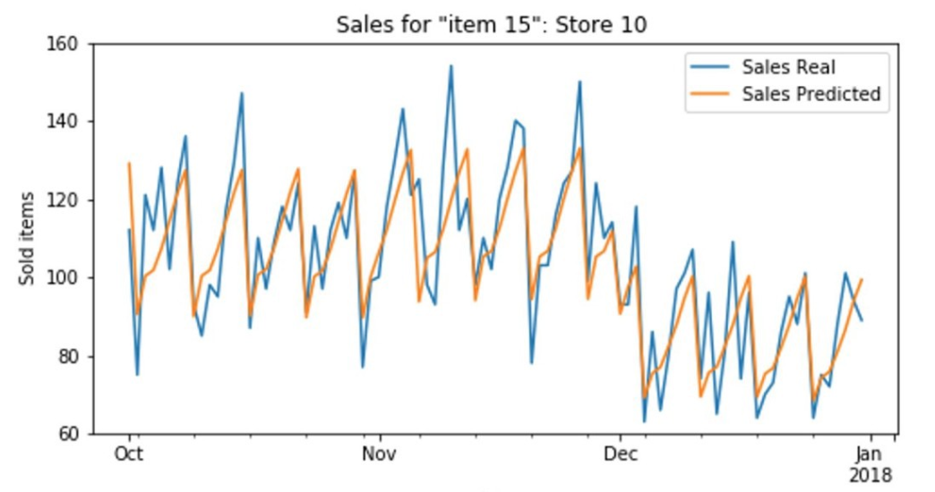 In this case we do not need to guess about a “core” probability distribution. Instead, we forecast using historical sales and all the factors that should affect the demand. It may include last N days of sales, week of year (seasonality), day of week, item category, store type, promotion, holidays, etc. The neural network trained on historical data, is able to learn patterns and trends that might be hidden and not clear at a first sight. After such training, DNN predicts demand/sales as a function of a number of all the factors (Fig.3). As a result, predicted demand becomes dynamic (as it should be). It also means that amount of goods we keep becomes more precise, i.e. much more efficient in a financial sense. In its turn, it may require a more dynamic supply chain as well.